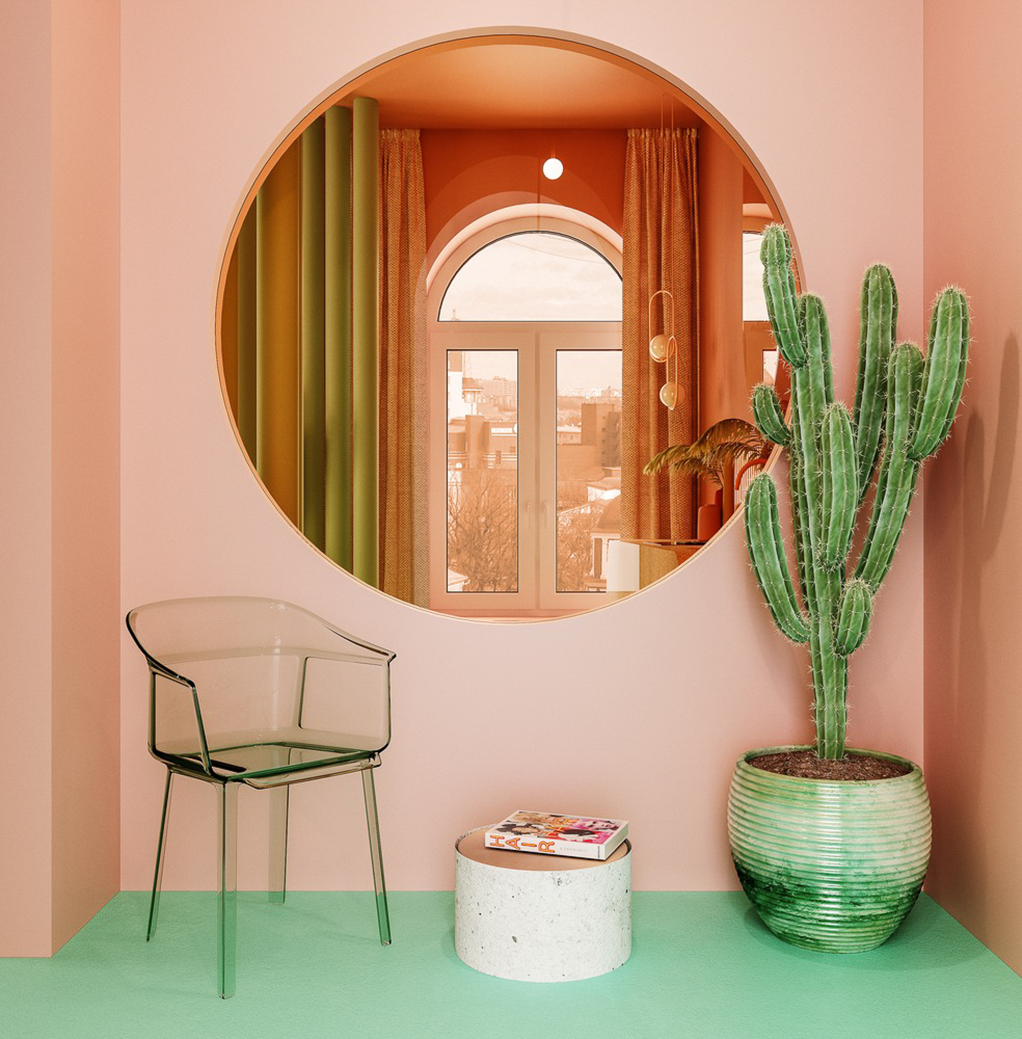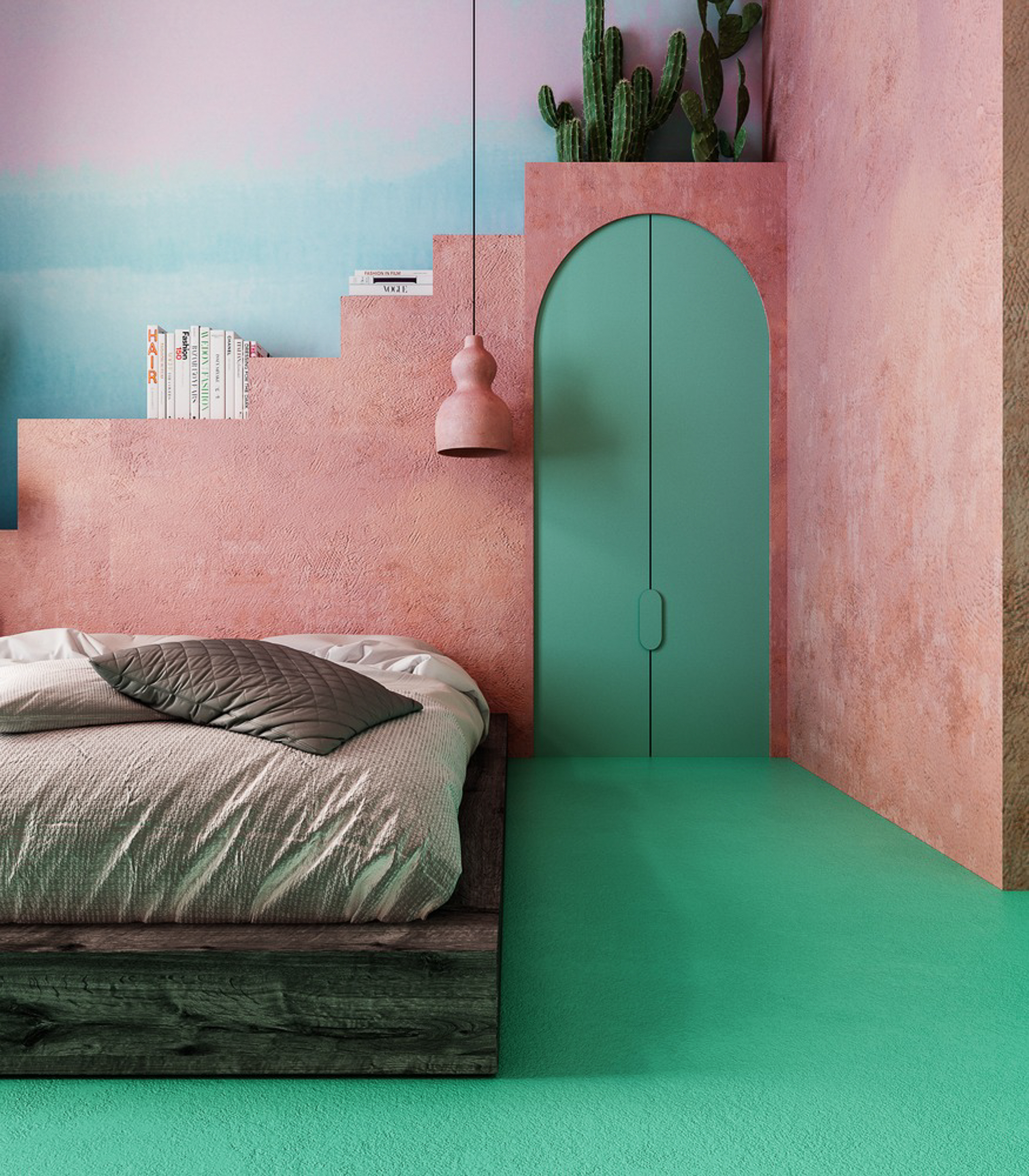 Màu sắc chủ đạo của căn hộ là xanh mint và màu hồng đất nung, hai màu sắc tưởng chừng không liên quan nhưng khi kết hợp với nhau thì tạo ra hiệu ứng thị giác quá đặc biệt và thu hút ánh nhìn. Xu hướng Chubby được thể hiện ở bộ ghế sofa xinh xắn, ở những chiếc đèn thả trần, những cái tủ và bàn cạnh tròn đẹp mắt…. Tất cả đã kết hợp cực hài hòa với nhau để mang đến cho gia chủ 1 không gian vui tươi và thoải mái.