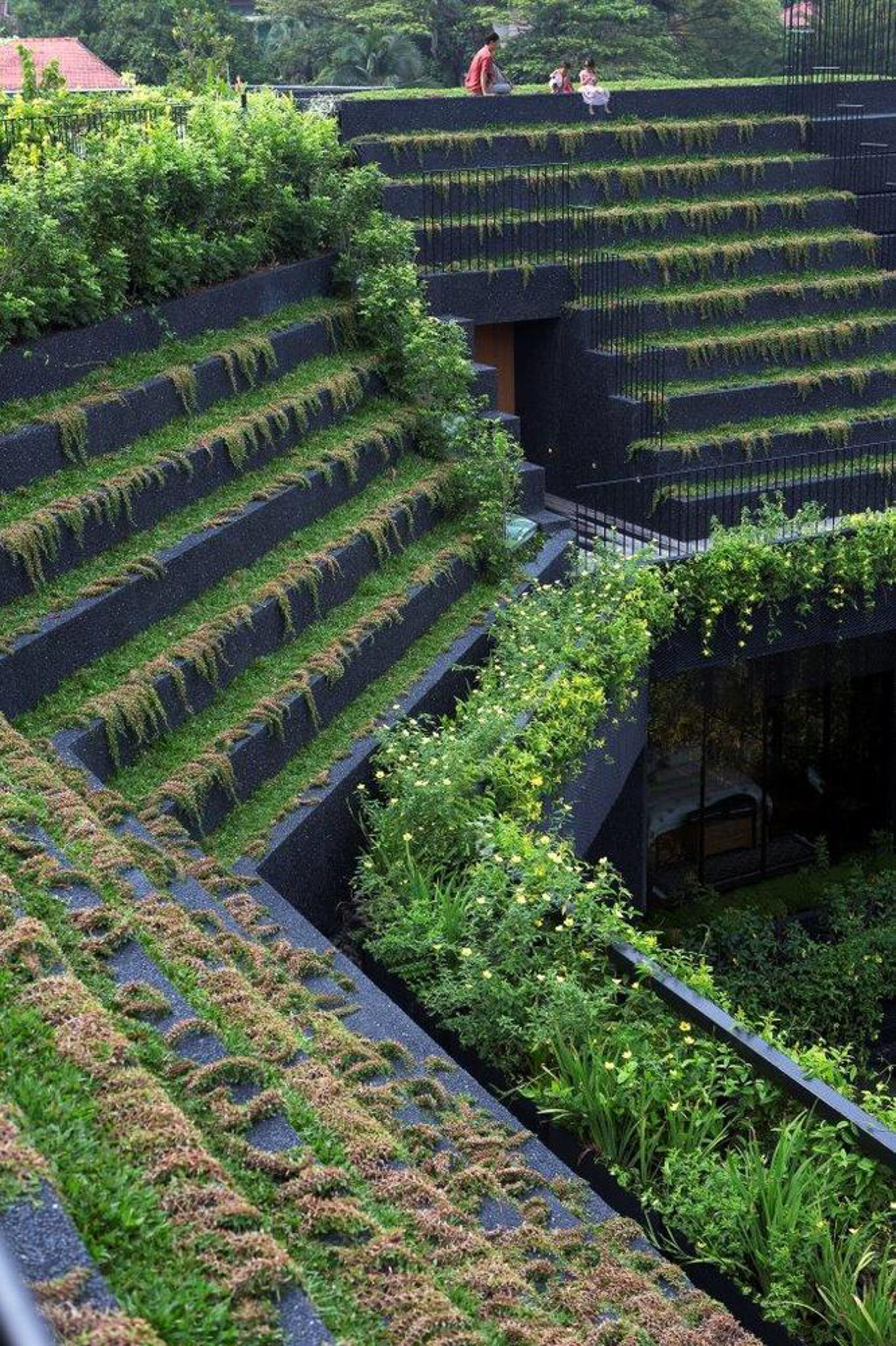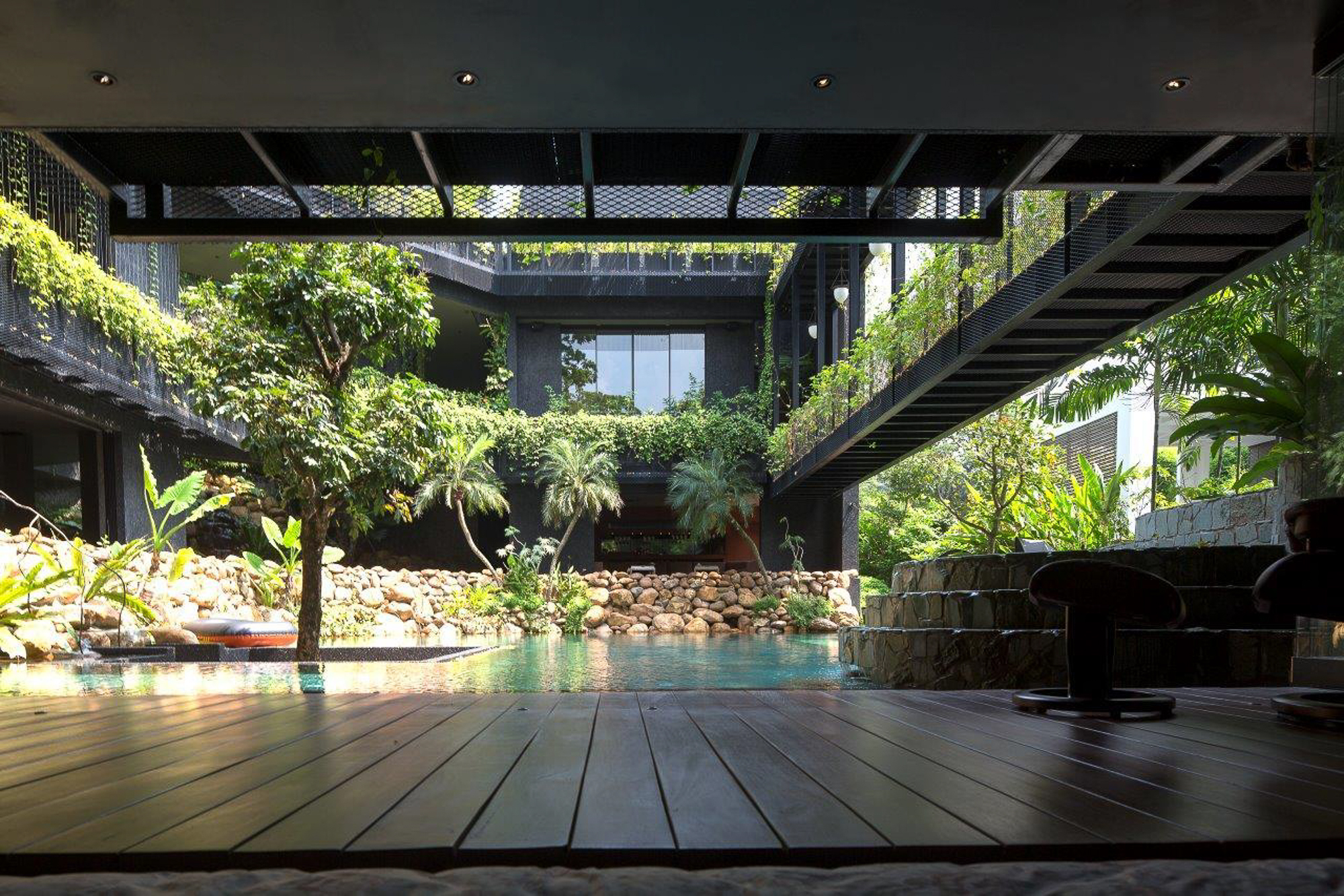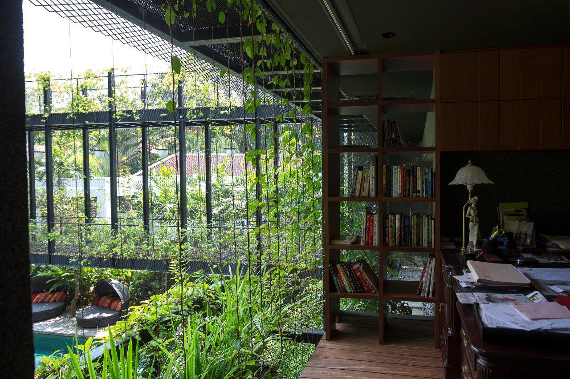Ngôi nhà như 1 ốc đảo xanh với các sàn cảnh quan và hồ bơi xung quanh. Trên các sàn trồng các loại thực vật khác nhau nằm theo các khu vực ngoại vi của các phòng và nhìn ra hồ bơi trung tâm.