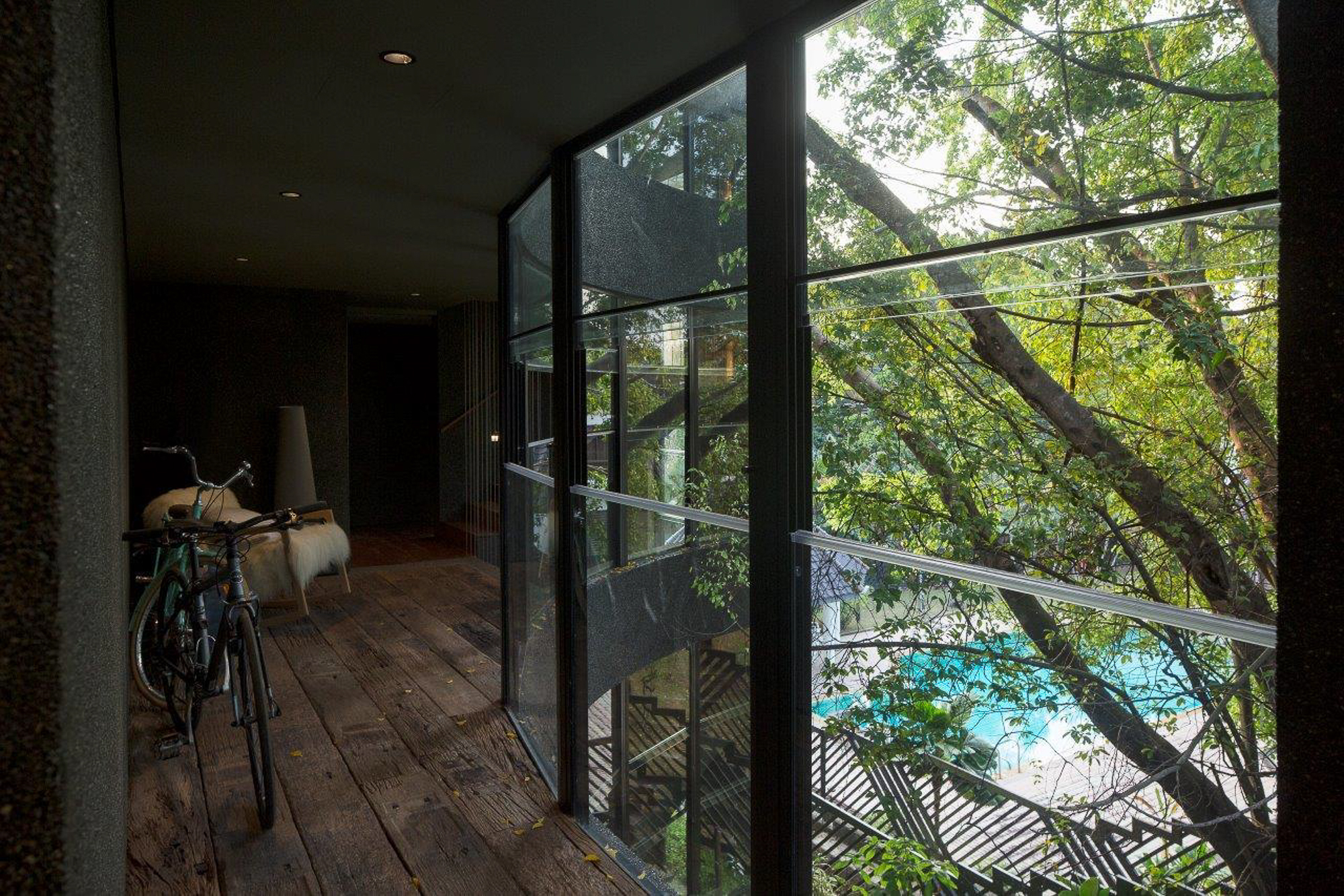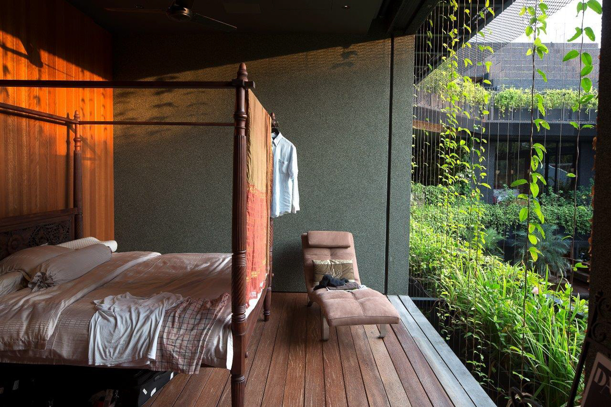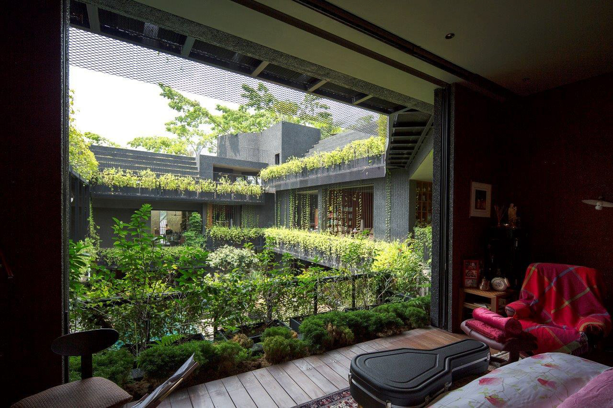 Ngôi nhà như 1 ốc đảo xanh với các sàn cảnh quan và hồ bơi xung quanh. Trên các sàn trồng các loại thực vật khác nhau nằm theo các khu vực ngoại vi của các phòng và nhìn ra hồ bơi trung tâm.